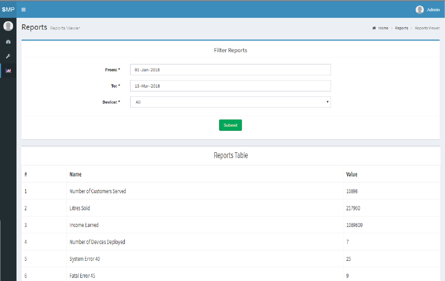 Powered by Strong Web Platform, The machine owner can monitor and filter periodic reports using any internet enabled Devices including phones, laptops and tablets. Even where internet is not available, system offers daily sales report to subscribed suppliers via sms.